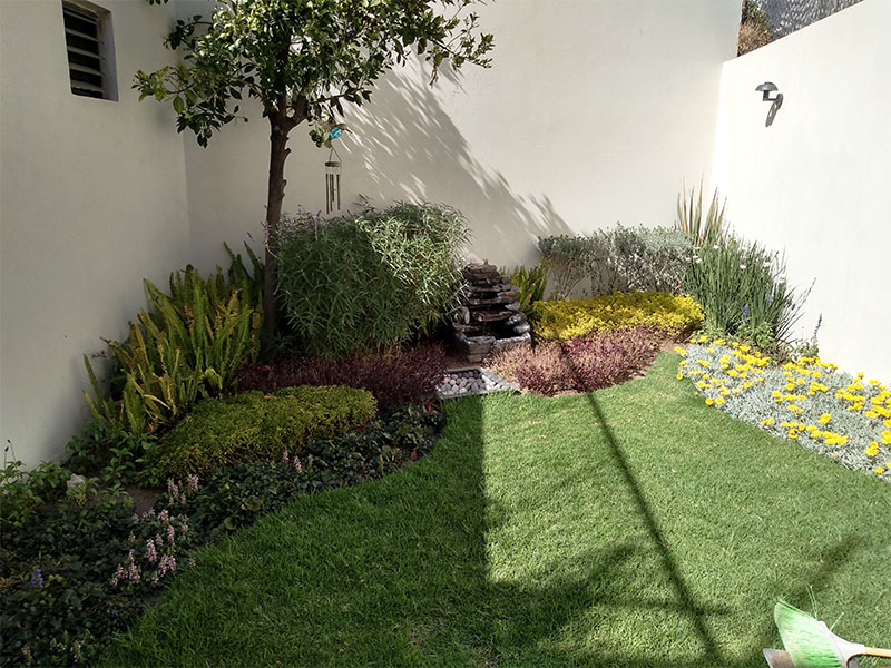 Este trabajo es un claro ejemplo de que aunque no se tenga demasiado espacio, aun así se puede tener un bello jardín; por las dimensiones la intención aquí fue el desarrollo de un jardín “contemplativo” en vez de un jardín “utilizable”, la diferenciación de alturas en la construcción del diseño fue importante para dotar al jardín de equilibrio, la utilización de follajes contrastantes y diferentes texturas de follajes le aportan brillo y personalidad al jardín.